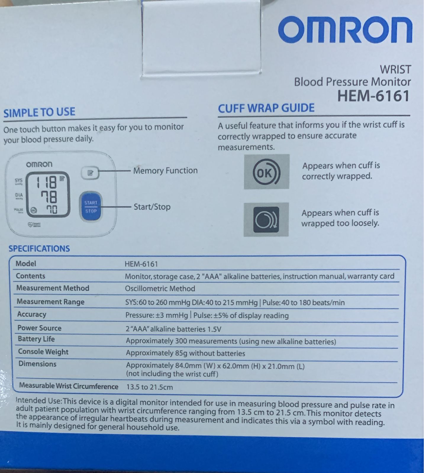 Omron Wrist Blood Pressure Monitor ( HEM – 6161)